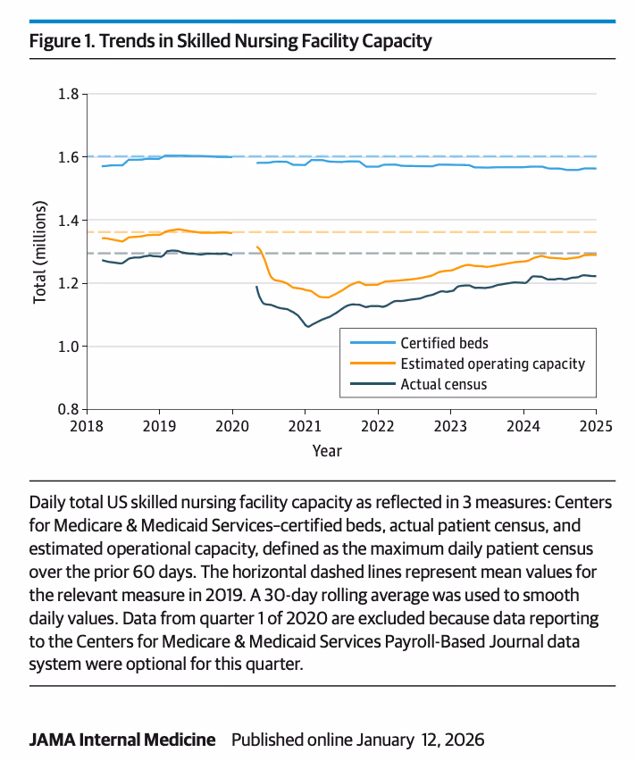 A JAMA Internal Medicine study published online January 12, 2026 found that while licensed SNF beds declined by approximately 2.5%, operating capacity fell by nearly 5% nationwide between 2019 and 2024. In more than a quarter of U.S. counties, operating capacity declined by 15% or more, with rural areas hit hardest.
